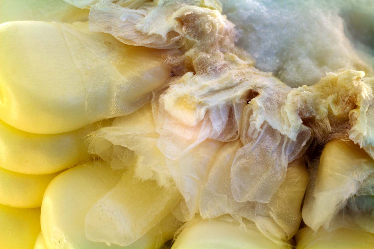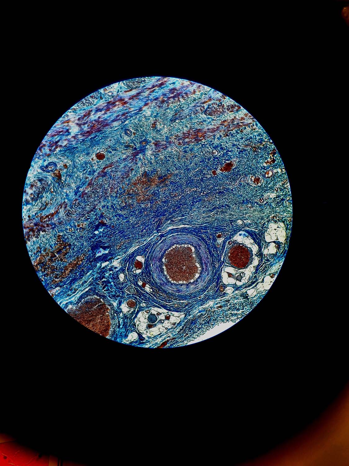 Revela un conjunto de tejidos bajo una técnica de tinción, donde se distinguen elementos del tejido conectivo y del sistema nervioso periférico. Esta visión microscópica evoca semejanzas con estructuras de dimensiones estratosféricas, como un planeta, invitándonos a reflexionar sobre la intrincada belleza y la universalidad de los patrones en la naturaleza.