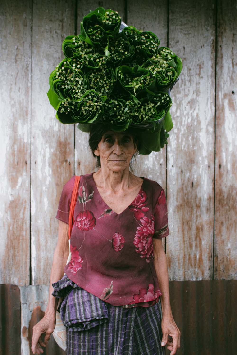 Representación de una mujer trabajadora que transporta sobre su cabeza manojos con hojas de bijao, recién recolectadas en las primeras horas de la mañana. Su rostro es un mapa de historias, en él se dibuja el cansancio de la jornada, pero también la esperanza.
