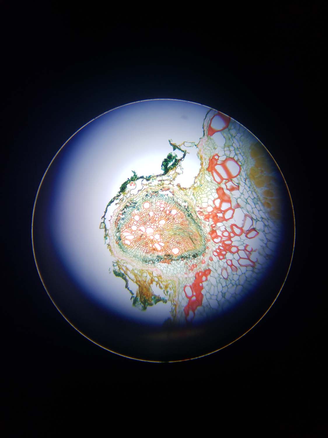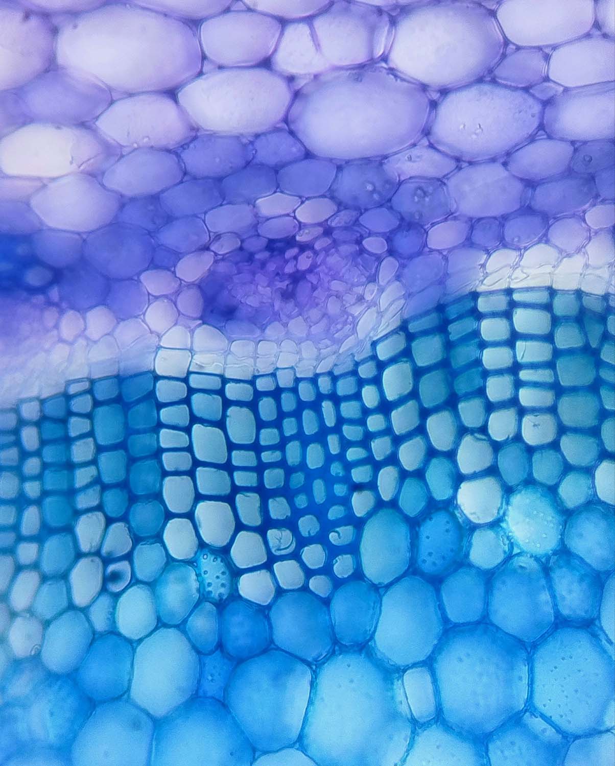 Muestra un corte transversal del quinto entrenudo de la angiosperma Salvia leucantha. La muestra fue tratada con una solución de hipoclorito de sodio y agua, y posteriormente teñida con azul de toluidina. Permite visualizar células parenquimáticas, xilema, floema y cambium vascular, revelando la complejidad de la vida vegetal.